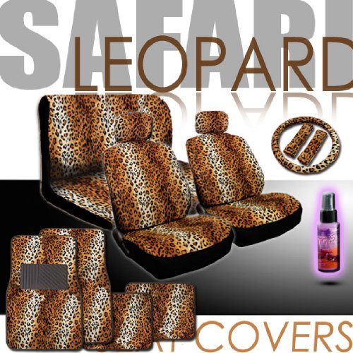 For Sale New 16 Pieces Safari Leopard Print Low Back Front Car Seat Covers, Rear Bench Cover, Seat Belt Covers, Steering Wheel Cover, 4 Pieces Carpet Floor Mats and a 2 oz Purple Slice Car Wash Free Detailer/Multipurpose Cleaner