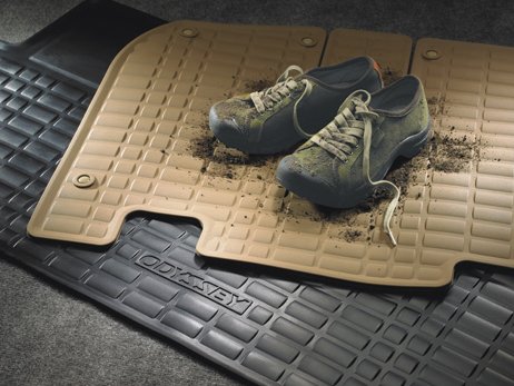 Color - Black Easily cleaned with mild soap and water. Functional design ridges trap dirt, sand, mud, and water. Custom appearance thanks to the molded logo. Complete set includes front and rear and third ( 3rd ) row mats Fits Model Years 2005 - 2010 Black Rubber Genuine Honda Original Factory OEM Accessory