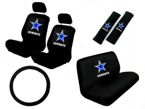 Feel the team spirit of the NFL football season! Support your team in your car with the Dallas Cowboys NFL Auto Interior Gift Set! The Dallas Cowboys NFL Auto Interior Gift Set includes 1 steering wheel cover, 2 bucket seat covers (2 top and 2 bottom), 2 headrest covers, 1 bench seat cover (1 top and 1 bottom), and 2 seat belt shoulder pads. The simulated leather steering wheel cover provides a soft comfortable grip and fits most standard size steering wheels (14.5 - 15.5 inch.) The steering wheel cover also protects your steering wheel from cracking or peeling. The bucket seat covers are made from 100% Polyester material, and are designed to fit most high and low-backed bucket seats. It can be installed over or under the headrest on vehicles with removable headrests, and some vehicles with armrests may need to have them removed and reinstalled for a semi-custom fit. These front bucket seat covers come with elastic straps and hooks that will snug and secure it under the seat. The shoulder belt pads provide relief from the stress of the seat belts. The perfect gift for anyone that loves the Cowboys team! Fill your car with the NFL Auto Interior Gift Set today! *WILL NOT FIT SEATS WITH ANY OF THE FOLLOWING: 1. INTEGRATED SEAT BELT. 2. SEATS WITH SIDE AIRBAG. 3. OVERSIZED SEAT (captain seat). 4. SEATS WITH ARMREST (captain seat).* **Note: The seat covers in this set will only fit cars that are passenger sized (compacts, coupes, sedans, etc.) The seat covers will not fit seats in SUVs or Trucks.**